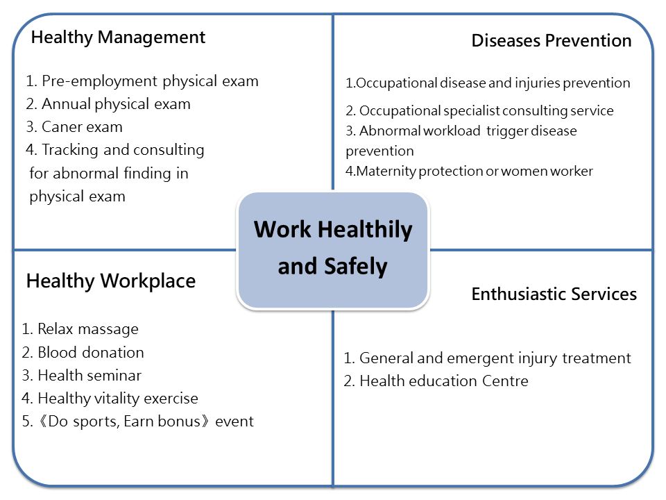 In addition to pre-employment physical examination we plan different medical screening according to ages, gender and occupational workplace characteristics so as to early detect health hazards and potential virulence factors. In order to enhance employees ’health self-management, we invite specialists to offer on-site consultant services if employees need assistance in their examination reports. To keep caring and tracking our employees’ health, we also arrange examination rechecks in hospitals by examination results or employees’ personal requirement.